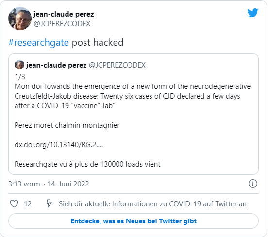 Es bestand der Verdacht, dass es Druck auf ResearchGate ausgeübt haben könnte, alles zu entfernen, was mit dieser Forschung zu tun hatte. Es wurde nicht wie üblich „zurückgezogen“ geschrieben und grundsätzlich gelöscht. Vielleicht waren die Berichte über die Zerstörung des Gehirns durch CJK besorgniserregender die Menschen von einer Impfung abhieltenals die Berichte über Thrombosen, Herzkrankheiten, Hepatitis, Todesfälle und Hunderte anderer Nebenwirkungen,
