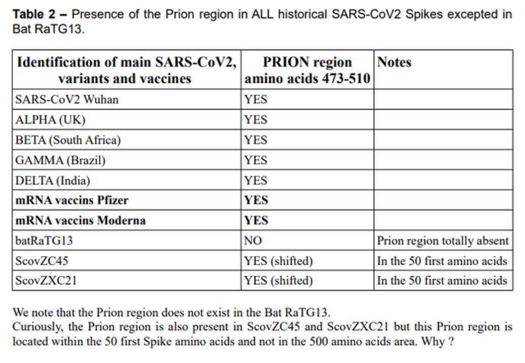 Die Studie zeigt, dass diese Prion-Region, die der Ursprung von CFK ist, auch in allen Covid-Impfstoffen enthalten ist, von der Sorte Wuhan bis Delta, aber nicht im Vorläufervirus BatRaTG13 und nicht mehr im Reisfeld von Omicron.
