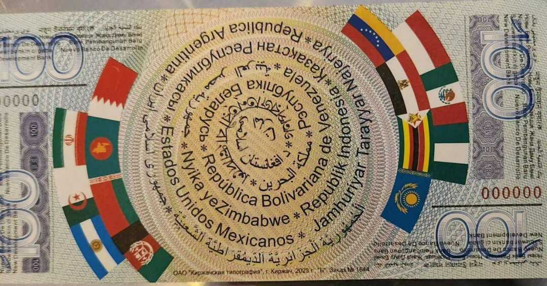 Die Banknoten tragen die Aufschrift „BRICS New Development Bank“ und nennen die Mitglieds- und potenziellen Mitgliedsländer der Organisation.