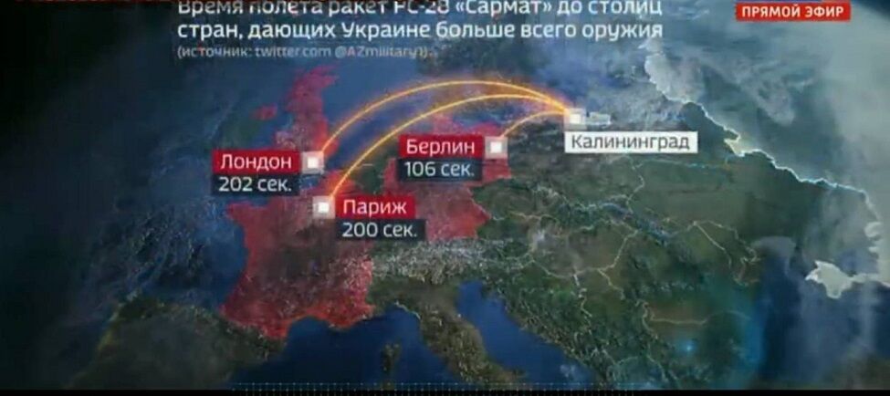 Bestätigt: „Die Vereinigten Staaten und ihre Verbündeten bereiten sich auf Russlands Einsatz von Atomwaffen vor“, sagte Unterstaatssekretärin Gloria Nuland heute, „Moskau verwendet Atomwaffen. Wenn Sie dies tun, werden Sie sich von diesem Effekt nicht erholen . “ Sie bestätigte dann: „Seit Beginn des Konflikts wussten wir bereits, dass Putins Drohung ernst genommen werden muss, weshalb sich die Vereinigten Staaten und ihre Verbündeten auf diese Entwicklung vorbereiten“, sagte Nuland. Die erstaunliche Bemerkung des US-Außenministers erfolgte nur einen Tag, nachdem Rossia 1, der führende neue Fernsehsender der Russischen Föderation, eine Karte wie die obige in ganz Russland ausgestrahlt hatte. Wenn eine russische Interkontinentalrakete „Salmat“ von Kaliningrad abgefeuert wird, verdunstet sie laut dieser Karte Berlin, Deutschland, 106 Sekunden nach dem Start, Paris, Frankreich, 200 Sekunden, und London, England, 202 Sekunden. Alle drei Städte werden kurz nach dem Start verschwinden. Eine einzige russische Salmat-Rakete wird alle drei Städte zerstören! Selbst in London, der am weitesten entfernten Stadt vom Start bis zur Landung, sind Radarwarnungen nur etwa dreieinhalb Minuten … bis zum Premierminister. Ich habe nicht einmal Zeit zu fragen um die Erlaubnis zum Gegenangriff, noch warne ich die breite Öffentlichkeit, zu evakuieren. Die Bevölkerung dieser Städte ist wie folgt.
