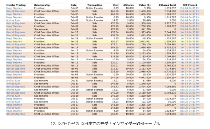 Insiderhandel ist in Moderna alltäglich, aber es ist unklar, wie er mit den Regeln der US Securities and Exchange Commission vereinbar ist. Der aktivste Insiderhandel ist Nova Afeyan , Chairman und Co-Founder von Modernas Non-Executive Independent Director . Er besitzt mRNA-Aktien im Wert von 1,5 Milliarden US-Dollar und hat in den letzten 18 Jahren ungefähr die gleiche Menge verkauft. Seit 2019 hat es Aktien im Wert von 455 Millionen US-Dollar verkauft. Auch Führungskräfte anderer Unternehmen betreiben Insiderhandel, aber der Umfang sei „klein“. Zum Beispiel besitzt Moderna-Präsident Stephen Hogue Aktien im Wert von 260 Millionen US-Dollar und handelt mit 35 Millionen US-Dollar.