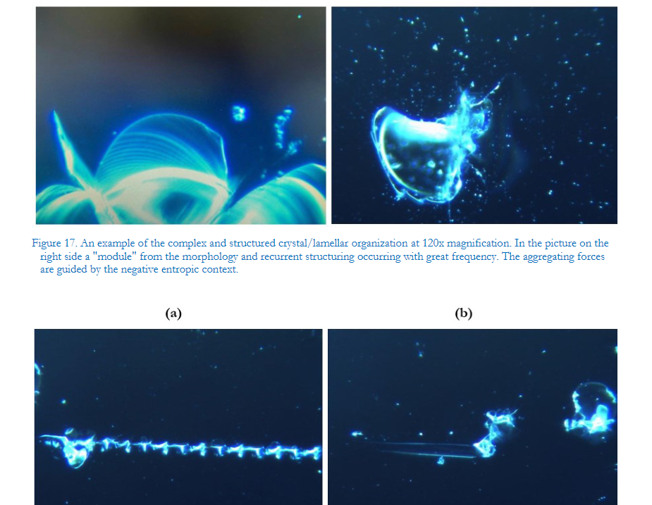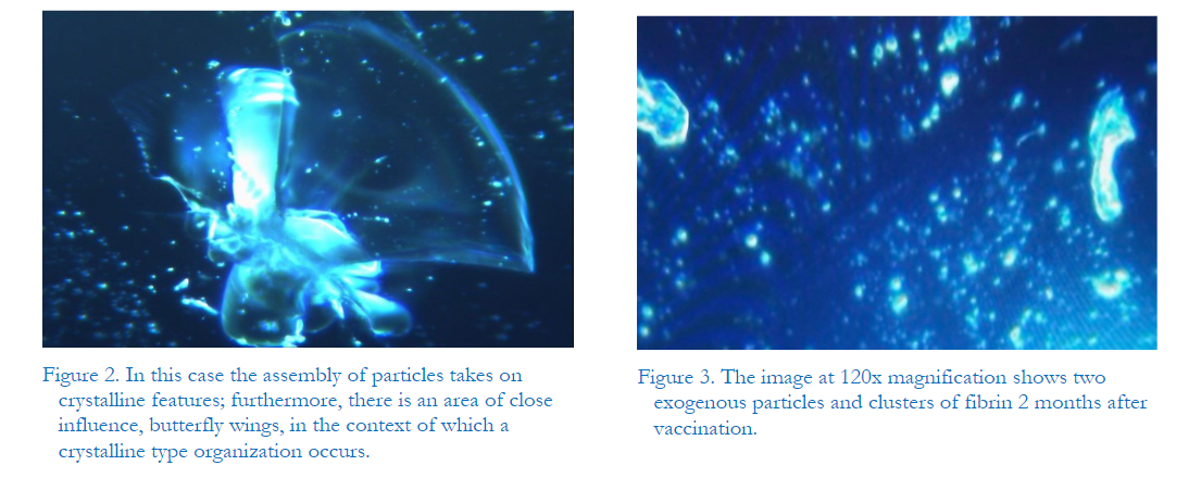 Ansicht der Dunkelfeldmikroskopie-Analyse von Blut von 1.006 symptomatischen Personen nach Pfizer/Biontech- oder Moderna-Anti-COVID-mRNA-Injektion (ijvtpr.com) von 1.006 Moderna- oder Pfizer-letzter mRNA. Insgesamt 58 Patienten (27 Männer und 31 Frauen) hatten völlig normale Werte Blut bei der mikroskopischen Analyse nach der Injektion, was 5,77 % der Gesamtzahl entspricht. Impfstoffe sollen mindestens das Spike-Protein von SARS-CoV-2 enthalten (Nance & Meier, 2021), aber auch Fremdstoffe, von denen die CDC und viele Befürworter experimenteller Injektionen behauptet haben, dass sie vollständig fehlen Unter diesen Fremdkörperkomponenten, die Lee et al (2022) zuvor in diesem Journal gezeigt haben, waren auch metallische Objekte , was auch durch unsere unten beschriebenen Ergebnisse bestätigt wird. Figur 4). Die hier zusammengefassten vier Fälle sind nach unserem Verständnis und der klinischen Expertenmeinung vollkommen repräsentativ für alle 948 Fälle, die periphere Blutveränderungen aufwiesen. Dieses 120-fache Bild (digital 3-fach vergrößert) hebt die typische selbstaggregierte Struktur des faserigen/röhrenförmigen Modus hervor. In diesem Fall nehmen die Teilchenaggregate kristalline Eigenschaften an. Darüber hinaus gibt es Bereiche mit engem Einfluss, wie Schmetterlingsflügel, im Zusammenhang mit der Entwicklung von kristallinem Gewebe. Ein 120-faches Bild zeigt zwei Fremdpartikel und Fibrin-Cluster 2 Monate nach der Impfung .