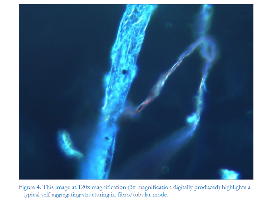 Der Patient ist ein 33-jähriger ehemaliger Athlet, der vor der mRNA-Injektion von Pfizer offenbar bei guter Gesundheit war. Einen Monat, nachdem er seine erste Dosis von Pfizers „Impfstoff“ erhalten hatte, hatte er deutliche Asthenie und Kopfschmerzen von konstanter Schwere (d. h. Kopf- und Körperposition und -bewegung, so dass das Auf- und Abbewegen des Kopfes den Schmerz verstärkte). empfindlicher Kopfschmerz). Kopfschmerzen sprechen nicht auf übliche Analgetika an. Diffuse rheumatoide Arthralgie mit Dyspnoe bei Anstrengung wurde festgestellt. Abbildung 5: Hochstrukturierte röhrenförmige Faserstrukturen. In (a) und (b) ist bei 40-facher Vergrößerung eine scheinbar geschichtete Konnektivität sichtbar. In (c) bei 120-facher Vergrößerung (3-fache digitale Verarbeitung) gibt es einen Komplex mit einer Länge von 166,54 μm (DeltaPix-Software). Es gibt viele weitere Fotos und Erläuterungen zu den Analyseergebnissen, aber der vollständige Text ist sehr lang, daher werde ich ihn weglassen. Um den vollständigen Artikel zu lesen: Ansicht der dunkelfeldmikroskopischen Analyse des Blutes von 1.006 symptomatischen Personen nach Anti-COVID-mRNA-Injektionen von Pfizer/BioNtech oder Moderna (ijvtpr.com)
