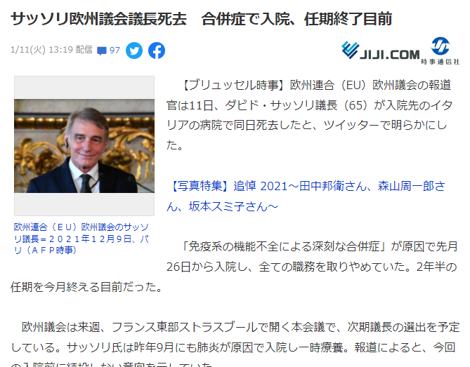 Sassoli starb am 11. Januar in einem Krankenhaus des onkologischen Forschungszentrums von Aviano in seiner Heimatstadt Friuli Venezia Giulia, Italien. Es überrascht nicht, dass viele aufmerksame Leser ihre Relevanz für Impfkampagnen in Frage stellen, zumal Krebspatienten berichten, dass sie nach der Injektion von mRNA eine große Anzahl von Krankheiten erlitten haben. Der aktuelle Kenntnisstand kann diese Frage jedoch weder vollständig beantworten noch ihre Relevanz belegen. Es wurde bekannt gegeben, dass der Stuhl während der Behandlung einer Lungenentzündung im September geimpft worden war.Die Untersuchung dieses Falls führte auch zu einer bitteren Rede am 15. Dezember in Anwesenheit der Präsidentin der Europäischen Kommission, von der Leyen. „Und laut Wissenschaftlern und ersten Daten zu Omicron-Varianten haben sich drei Impfungen als die beste derzeit weltweit verfügbare Abwehr gegen Omicron herausgestellt. “ Dies ist falsch und irreführend im Vergleich zu allen derzeit international verfügbaren Daten. Hoffentlich, ich hoffe nur, dass der Vorsitzende von diesem Wort getrieben wurde und sich weigerte, den „Auffrischimpfstoff“ zu erhalten.