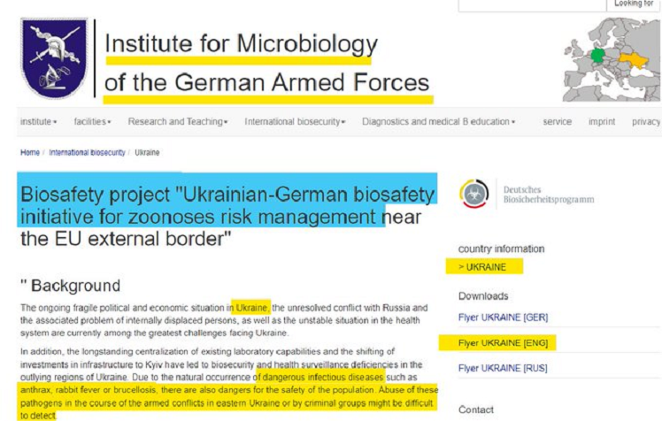 Am 18. Juli 2018 wurde ein Memorandum of Understanding (MOU) zwischen dem Public Health Center des ukrainischen Gesundheitsministeriums und dem Bernhard-Nocht-Institut für Tropenmedizin BSL unterzeichnet. Die beiden Parteien haben im Rahmen eines gemeinsamen Forschungsprojekts zur Verbesserung des Niveaus der Biosicherheit durch Verbesserung der Diagnose und Erforschung der Prävalenz des hämorrhagischen Krim-Kongo-Fiebers (CCHF) und des Orthohantavirus in der Ukraine im Zeitraum 2018-2019 eine Zusammenarbeit vereinbart. Es wurde vom Auswärtigen Amt der Bundesrepublik Deutschland gefördert (Projekt Nr. 68727 EN 02761868). Im Rahmen dieses Projekts wurden 1000 Serumproben von Bürgern aus verschiedenen Teilen der Ukraine, die ausschließlich der slawischen Volksgruppe angehören, an das Bernhard-Nocht Tropenmedizinische Institut in Hamburg geschickt. Russland argumentiert, dass eines der Ziele der Vereinigten Staaten und ihrer NATO-Verbündeten darin besteht, gefährliche Bioagenten zu entwickeln, die selektiv auf verschiedene ethnische Gruppen abzielen, einschließlich slawischer ethnischer Gruppen.