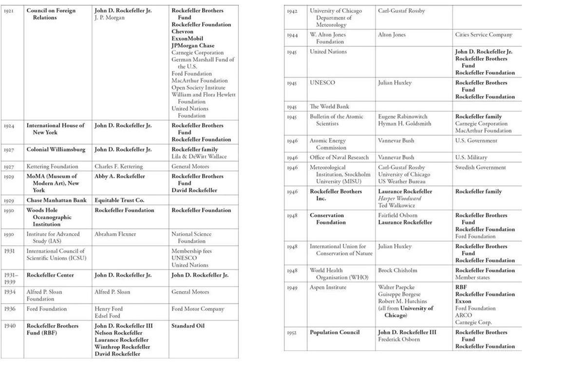sie Mitbegründer der Atomic Energy Commission, des Office of Naval Research und der National Science Foundation. Dies ist nur eine unvollständige Liste. Jede dieser Institutionen ist neo-malthusianisch und darauf bedacht, die Zahl der Menschen zu reduzieren und uns vom Land in riesige Gehege zu verlegen, um sie zu kontrollieren, zu messen und zu monetarisieren . (*15 Minuten Stadt) 1989 kündigte die Haager Erklärung (unterzeichnet von 24 Ländern) die Expansion der Rockefeller-Familie nach Übersee an, mit dem Ziel, die Erdatmosphäre zu schützen und die globale Erwärmung zu bekämpfen. Sie suchte nach einer neuen internationalen institutionellen Autorität. Dann, ebenfalls im Jahr 1989, gründete der Rockefeller Brothers Fund unter der Leitung von David Rockefeller und Henry Kissinger das UN-Gremium für Klimaänderungen (IPCC) und stellte ihm nahezu unbegrenzte Mittel zur Verfügung. Im Anhang zu Nogungaards Buch sind alle Institutionen aufgeführt, die die Familie gegründet hat. Nach einem kurzen Scan sprang ich von meinem Schreibtischstuhl und schrie ins Leere. Der Hund verschwand und die Katze versteckte sich. Sie nutzten ihre Macht, um jede Institution zu korrumpieren, die ihren Endzielen diente. Hier ist eine Seite.