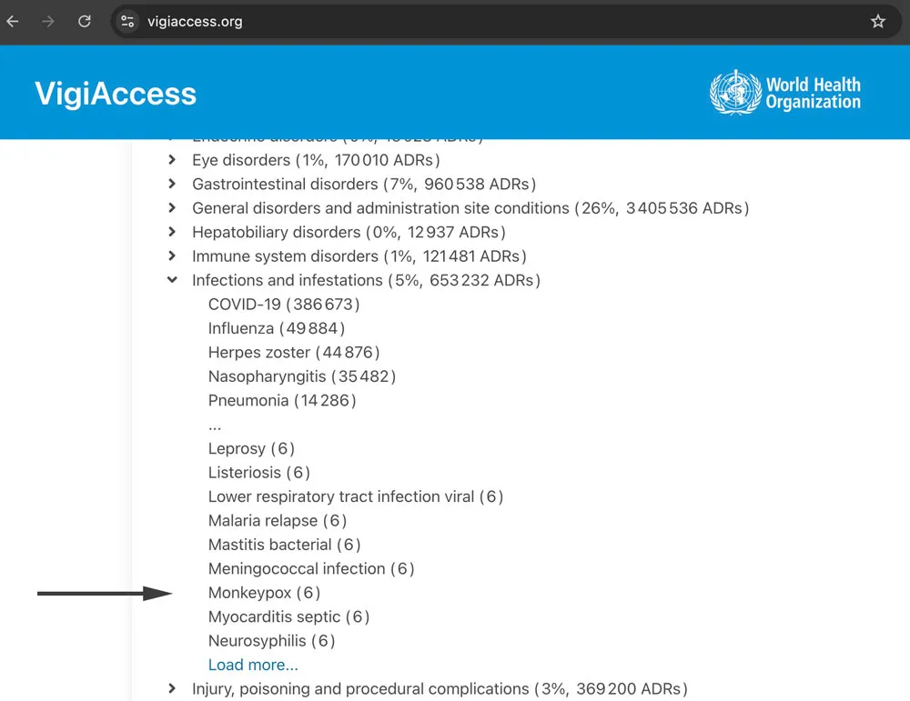 weiter scrollen und auf „Mehr laden“ klicken, bis Sie „Affenpocken (6)“ und „Kuhpocken ( 5) „