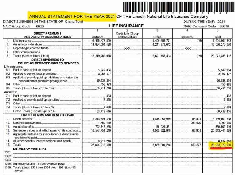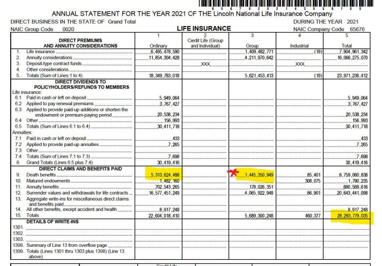 Laut dem Jahresbericht der Lincoln National Life Insurance Company zahlte das Unternehmen im Jahr 2019 mehr als 500 Millionen US-Dollar an Todesfallleistungen im Rahmen von Gruppenlebensversicherungsverträgen und in den Jahren 2020 und 2021 etwa 548 Millionen US-Dollar. Es stellt sich heraus, dass die .