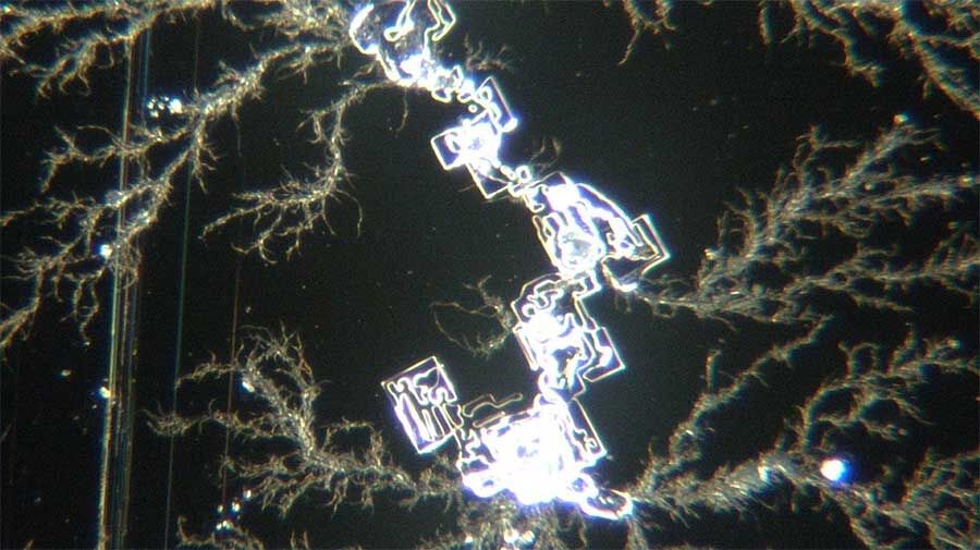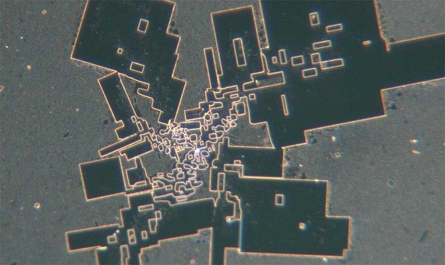Weitere Versuche und Irrtümer führten zu interessanten Aktivitäten und Arrangements, aber es wurde kein dramatisches neues Bild geboren. Ich habe es am 16. Januar erneut plattiert. Dann bin ich an einem heißen Tag in die Stadt gefahren und habe es bei heruntergelassenen Fenstern im Auto gelassen. Die Temperatur stieg im Freien auf etwa 28 °C und im Auto auf etwa 40 °C an. Als ich nach Hause kam, fand ich dieses Bild voll auf der Folie. Der Versuch wurde erfolgreich abgeschlossen. Das Bild unten stammt von einem Objektträger mit einem Tropfen frischem menschlichem Blut und einem Tropfen Impfstofflösung. Wenn Blut und Flüssigkeit in Kontakt kommen, verschwinden die weißen Blutkörperchen und die roten Blutkörperchen werden stark geschädigt. Ich konzentrierte mich darauf, so viel wie möglich zu fokussieren, dachte aber nicht wirklich darüber nach, was ich fotografierte. Wenn Sie jedoch später genau hinsehen, war es eindeutig ein Nanotech-Chip-ähnliches Bild, das mit einem „Code“ verknüpft war . Ein Teil des Codes kann aus Fibrin bestehen. Sicher ist aber, dass beim Mischen mit menschlichem Blut auf dem Objektträger etwas anderes passiert als „Impfstoff allein“ . Es gab auch so eine erstaunliche Skulptur. Ich frage mich seit Monaten, warum diese Infektion so schwerwiegend ist, selbst wenn Sie sich von COVID erholt haben, müssen Sie jeden auf dem Planeten mehrmals impfen. .. Dies ist beispiellos in der Geschichte der Impfstoffe.