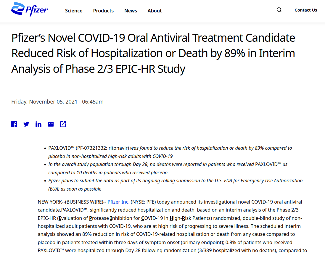 Darüber hinaus haben Tests von Pfizer-Wissenschaftlern an Petrischalen gezeigt, dass sie einige Auswirkungen auf die Omicron–Canada- Spezifikation vom 22. Januar Auf der Grundlage dieser sehr dünnen Beweise berichten die Mainstream-Medien ausführlich, dass „dieses Medikament voraussichtlich gegen Omicron wirksam sein wird“.