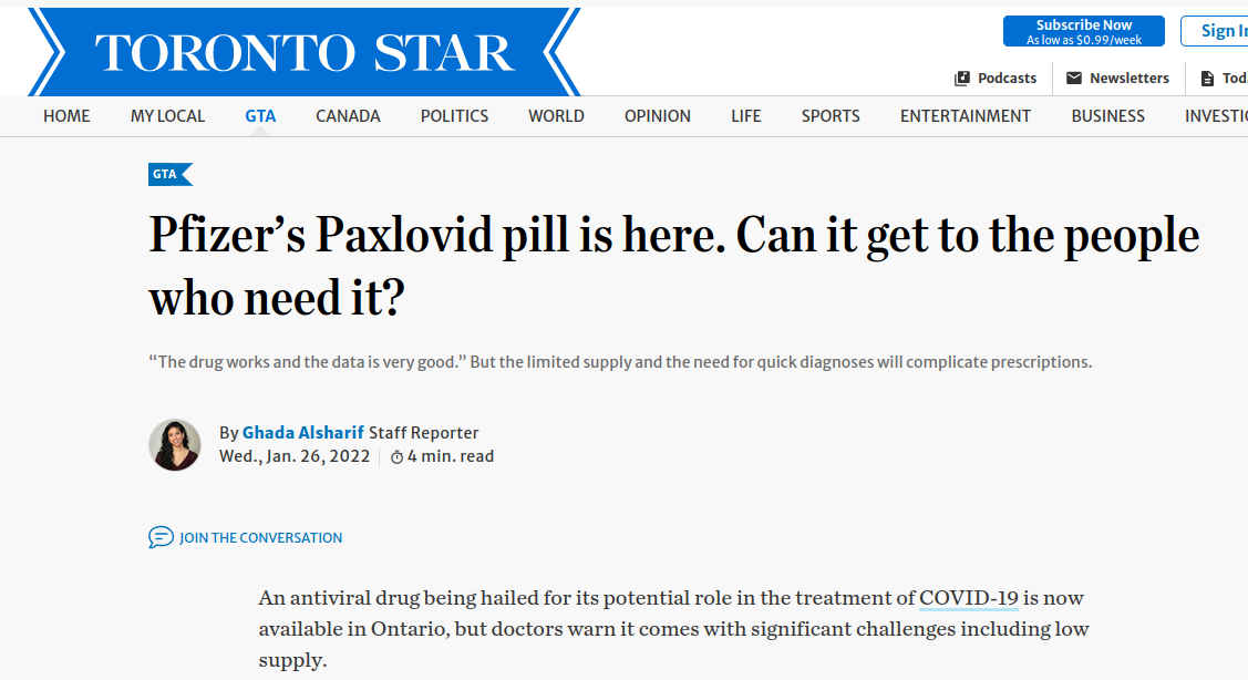 Auch große Medien machen die Droge hoch. Zum Beispiel berichtete der Montrealer Journalist Verity Stephenson am 18. Januar CBC, dass „ Paxrovid das Risiko einer Krankenhauseinweisung und des Todes um 89 % im Vergleich zu Placebo reduziert hat.“ das Medikament als „Placebo“-Medikament bezeichnet wurde für sein Potenzial gelobt, Krankenhausaufenthalte wegen Viren zu reduzieren.“
