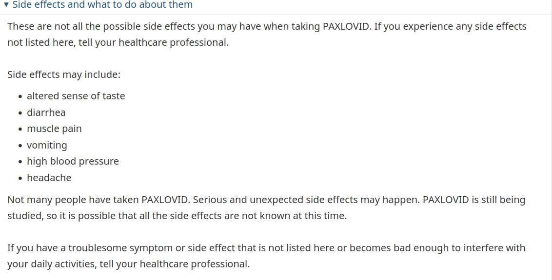 Der Artikel der National Post vom 25. Januar 2022 ist etwas außergewöhnlich. Der Autor Tom Blackwell weist auf das Problem hin, dass Paxlobid die Wirkung anderer Medikamente stört (dazu später mehr). Tom Blackwell weist auf das Problem hin, dass Paxlobid die Wirkung anderer Arzneimittel beeinträchtigt, erwähnt jedoch kaum die Hauptnachteile anderer Arzneimittel.Doch selbst die Bundesregierung von Kanada sagte auf einer öffentlichen Webseite über Pillen : „Nicht viele Menschen haben Paxrovid eingenommen. Es können schwerwiegende und unerwartete Nebenwirkungen auftreten. Paxrovid wird noch untersucht, daher wissen Sie zu diesem Zeitpunkt möglicherweise nicht alles die Nebenwirkungen.