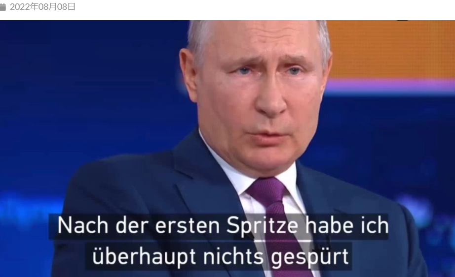 RT zitiert Putin mit den Worten, dass die einzige Möglichkeit, die Folgen der Pandemie zu überwinden, darin besteht, Impfungen und Tests fortzusetzen . Er selbst muss mehrfach geimpft worden sein, hatte sich aber (wie westliche Impfanhänger) bereits mit Corona infiziert. Wörtlich: „Ich möchte die Menschen ermutigen, sich impfen zu lassen und nicht ihre Zeit zu verschwenden.“