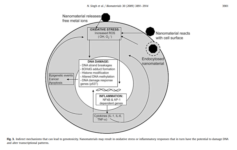 Es wurde festgestellt, dass viele technisch hergestellte Nanomaterialien genotoxische Reaktionen hervorrufen, darunter Chromosomenfragmentierung, DNA-Strangbrüche, Punktmutationen, oxidative DNA-Addukte und veränderte Genexpressionsprofile .