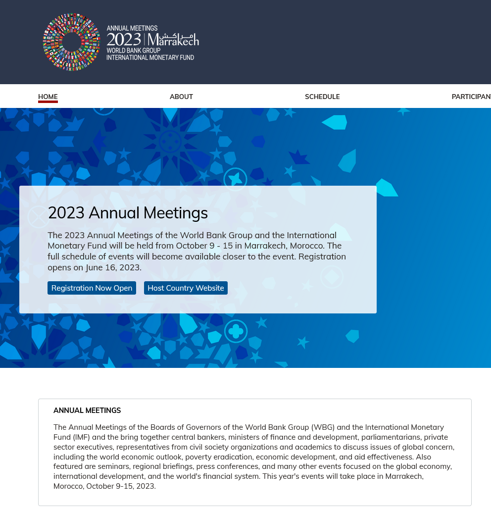 Die Generalversammlung 2023 der Weltbankgruppe und des Internationalen Währungsfonds (IWF) findet vom 9. bis 15. Oktober in Marrakesch, Marokko, statt. Der vollständige Veranstaltungskalender wird kurz vor der Veranstaltung veröffentlicht. Die Anmeldung zur Teilnahme beginnt am 16. Juni 2023.